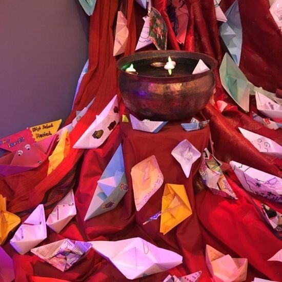 Walking through the installation, visitors were immersed in a site of Belonging, surrounded by banners designed by Cath Bristow featuring beautiful, intricate drawings printed on colourful fabric which hung down the walls and from the central gazebo. Inspired by writer, Susmita Bhattachayra, there were also streamers of paper boats, postcards, poems, recipes and stories linked together, hanging all along the walls that visitors stopped to read. A new music commission from Pooja Angra completed the scene.